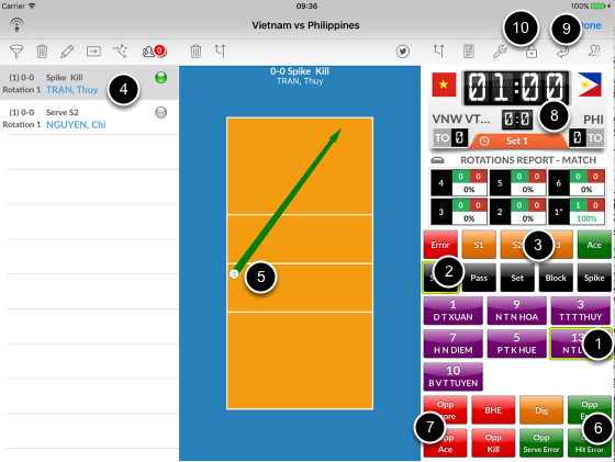 1. Select a player. The app guesses and chooses the most appropriate player and action but you can override by tapping on another player/action