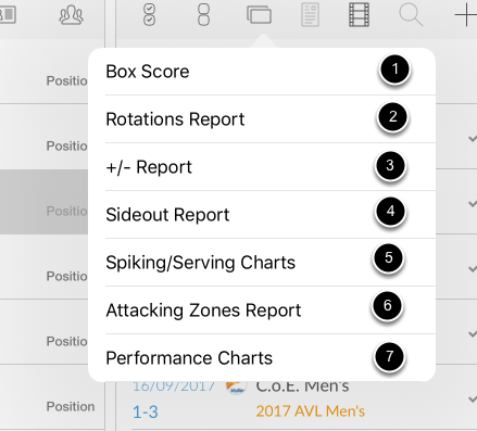 1. Box score 2. Rotations report 3. +/- report 4. Sideout report 5. Spiking/Serving chart 6. Attack Zones report 7. Performance chart