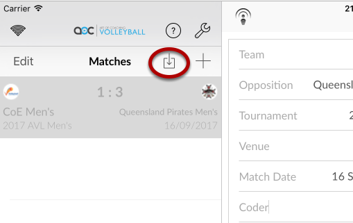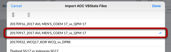 On Matches screen tap on the Import button to bring up the list of PSVB files in the app's Documents folder.