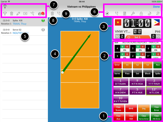 1. Coding pad 2. Mini reports 3. Scoreboard 4. Court view 5. Events list 6. Main tool bar 7. Events tool bar 8. Erase current ball path 9. Show opposition ball paths