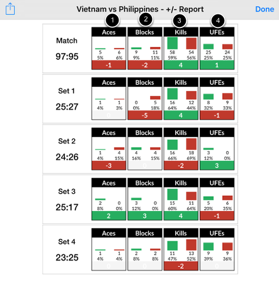 1. Aces 2. Blocks 3. Kills 4. Unforced errors