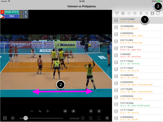 1. Select the first event on the list 2. Scroll video to where the event happens 3. Tap Synch button