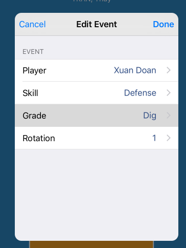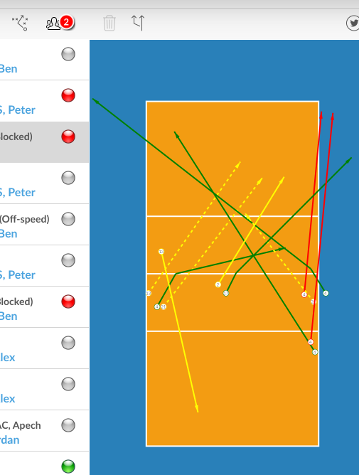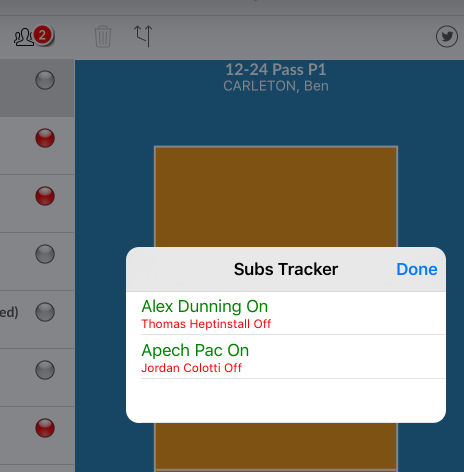1. Event filters 2. Delete selected event 3. Edit selected event 4. Insert below selected event 5. Show hits on court view 6. Substitutions tracker - number of subs is shown in red circle