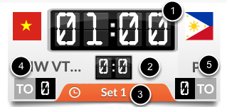 1. Set score 2. Match score 3. Set number. Tap here to modify set number or scores 4. Tap TO to indicate Team A's time out 5. Tap TO to indicate Team B's time out